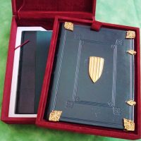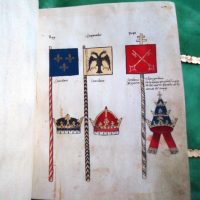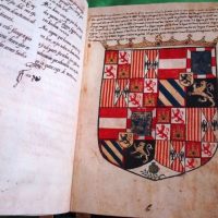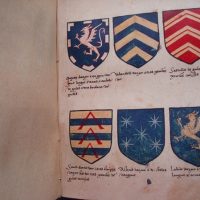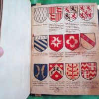The book accompanying study, as is normal in all of these works, also it contains the complete transcription of blasonamientos with a picture of each page of the original manuscript (it misses the publisher at the time did not include a few pages the translation of texts into Spanish) and an index of the members of this Armorial shields. The study book is bound in leather and fabric back to match facsimile, 200 pages, 21.5 x 27.5 cm. Study by Martin de Riquer, of the Royal Spanish Academy.