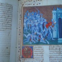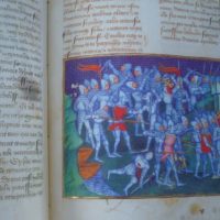 The manuscript illustrations are distinguished by their exquisite coloring and the fineness of the drawing. Two clearly differentiated miniaturists execute the miniatures of this wonderful codex. In the numerous scenes of battles that accompany the text of Guido delle Colonne, the intervention of a much more skillful hand is appreciated than in those referring to peaceful subjects. In them, the expression and the intense drama of the fierce battle are tangible.