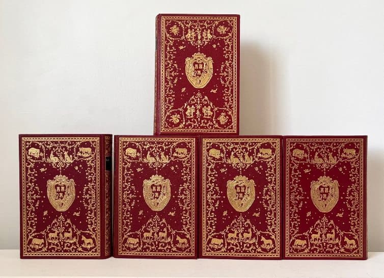 Volumes bound in high-quality bibliophile paper, richly gold-stamped leather, gilt top edge, and ribbon guide. 15 x 21 cm, with a total of 2,120 pages with various illustrations and all of Oudry’s full-page engravings, on special laid paper with the publisher’s watermark.