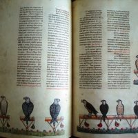 Facsimile bound in dry-worked leather on wood, guide tape, gilt edges, and with two gilt metal and leather closures. All according to the original manuscript. Format 27 x 37 cm. 222 pages with a multitude of drawings of birds, falcons, landscapes and falconers.