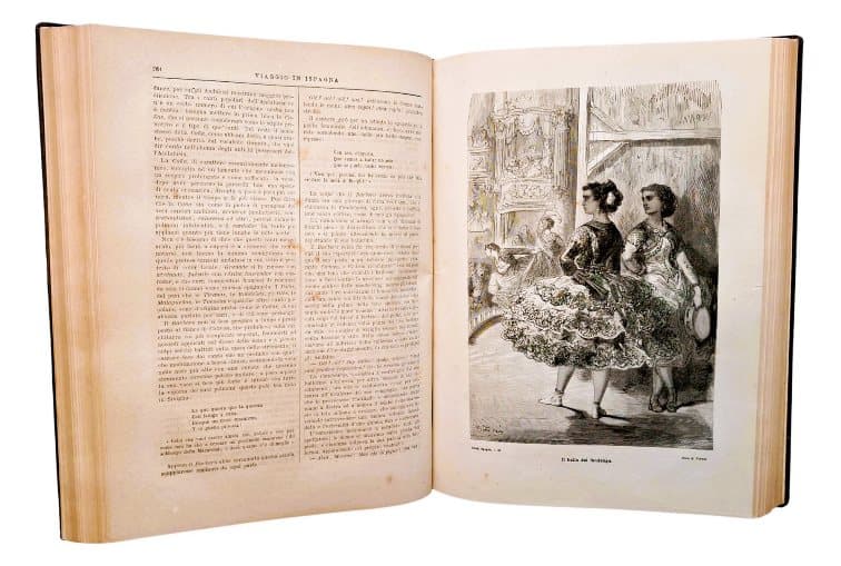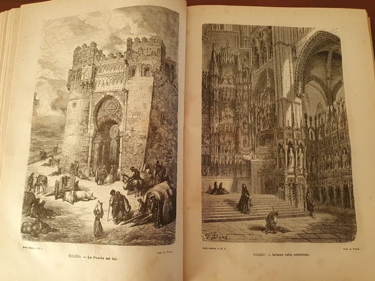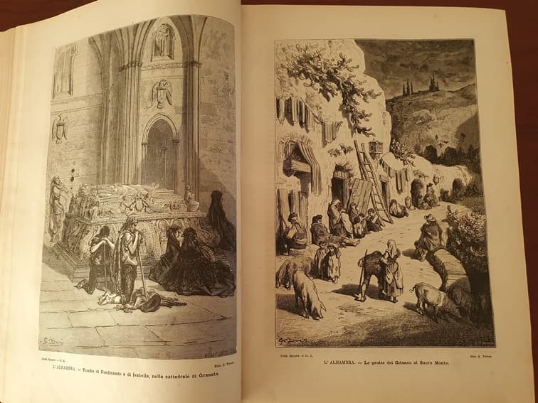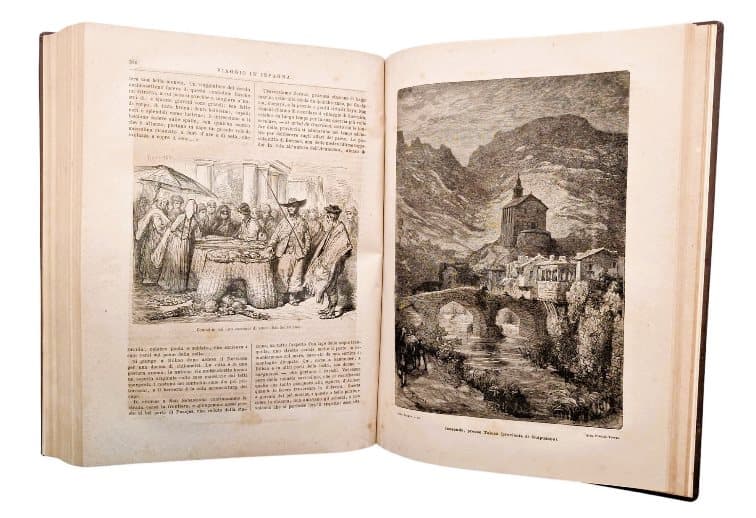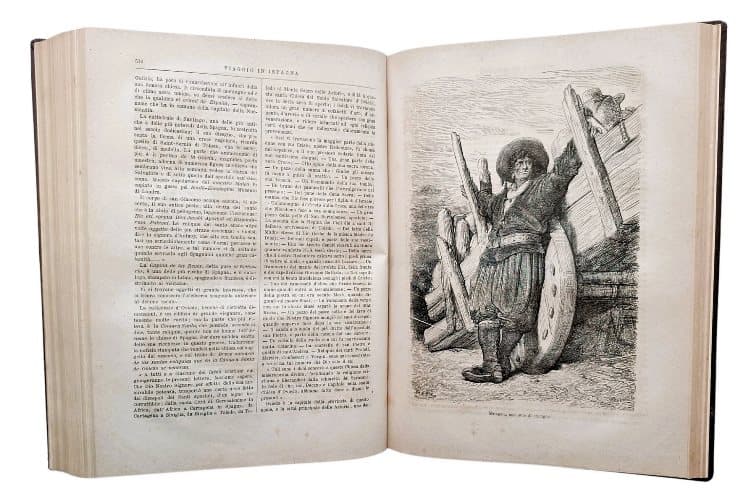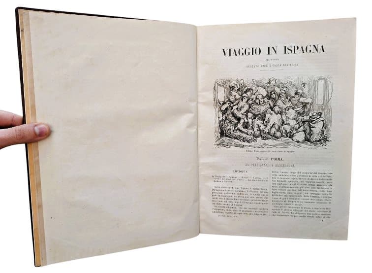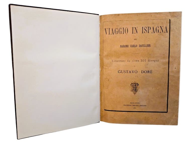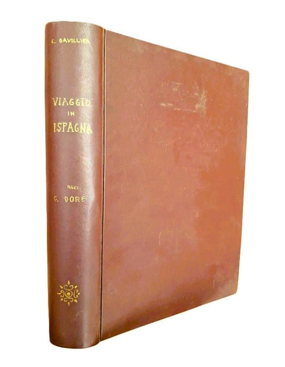 Rare first Italian edition of the account of the journey to Spain by the French Baron Carlo Davillier, superbly illustrated with over 300 drawings in the text and on a full-page cover by Gustave Doré. Milan, Fratelli Treves, 1874.