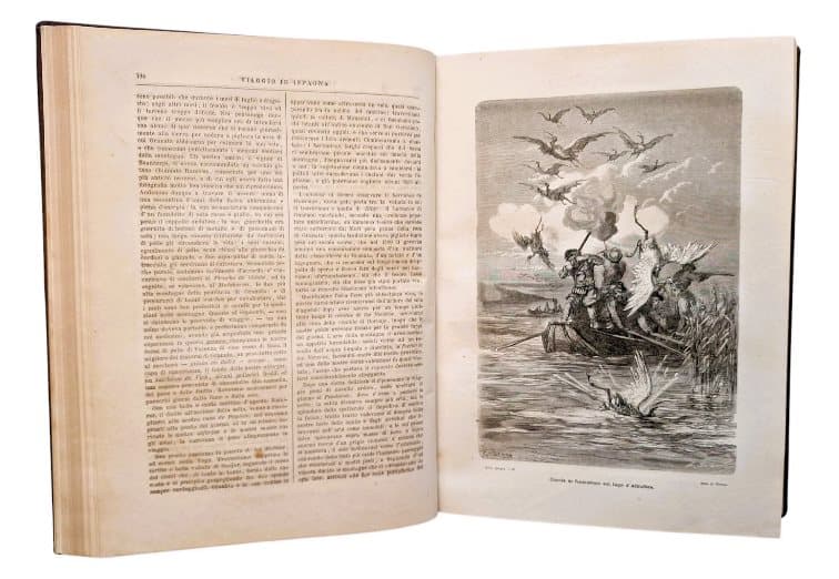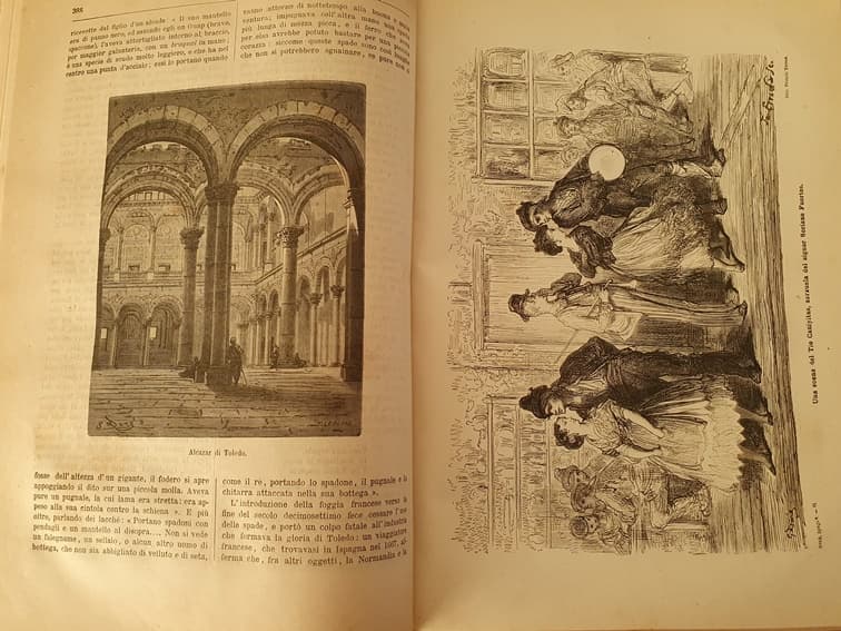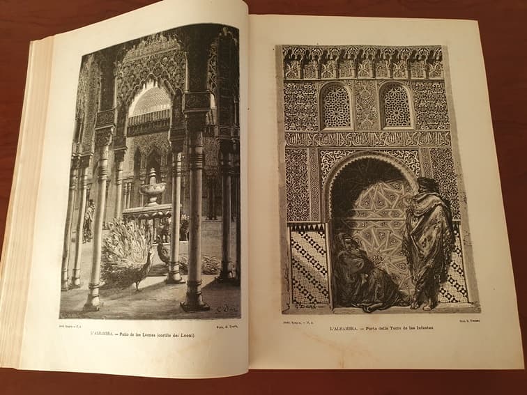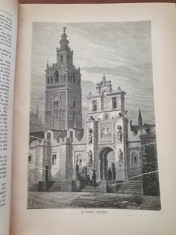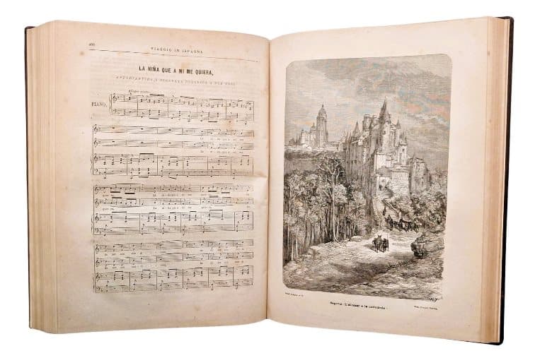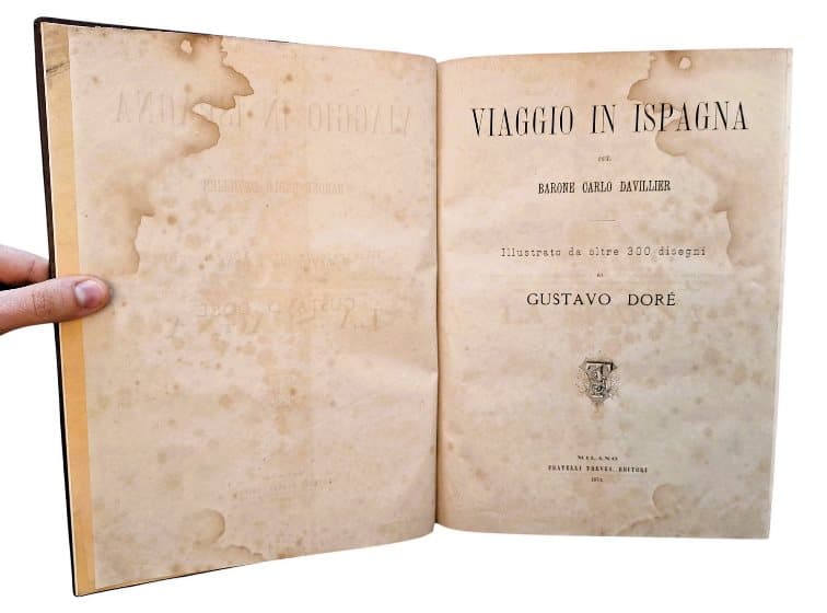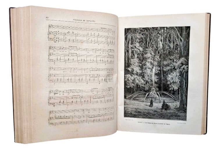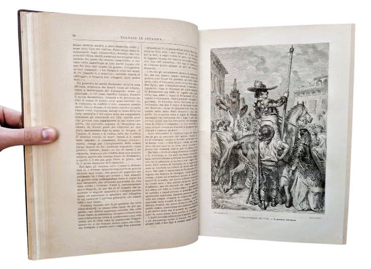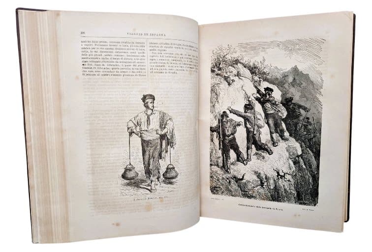 Rare first Italian edition of the account of the journey to Spain by the French Baron Carlo Davillier, superbly illustrated with over 300 drawings in the text and on a full-page cover by Gustave Doré. Milan, Fratelli Treves, 1874.