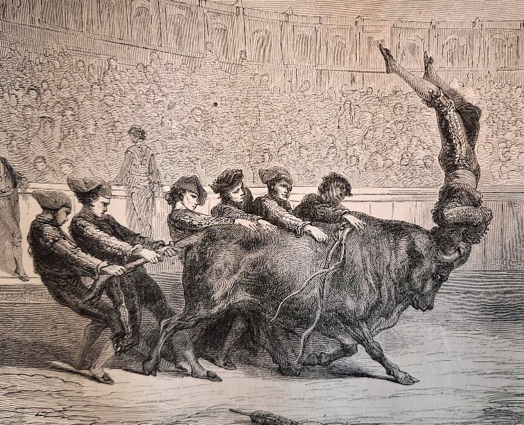 Jean Charles Davillier (Rouen, March 17, 1823 – Paris, March 1, 1883) was a French art collector and writer. His Voyage en Espagne (1875)—published in installments between 1862 and 1873 in the travel magazine Le Tour du monde and translated into Spanish under the title “Journey through Spain” in 1957—remains famous for its illustrations, mostly about bullfighting by Gustave Doré. The book also contains many illustrations of monuments, places, and popular figures of the time. The drawings, engravings, and lithographs about bullfighting in this book were also compiled in another publication under the title La Tauromachie de Gustave Doré.
