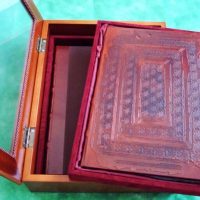 Todo ello se presenta en una bella, lujosa y noble caja estuche de madera con tapa de cristal biselado, 30 x 39 x 10 cm., 5,5 kgs., como corresponde a tan magna obra, y en cuyo interior se encuentran dos bandejas para alojar el volumen facsímile y el libro estudio.