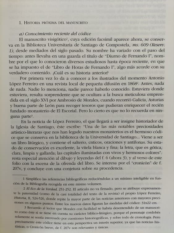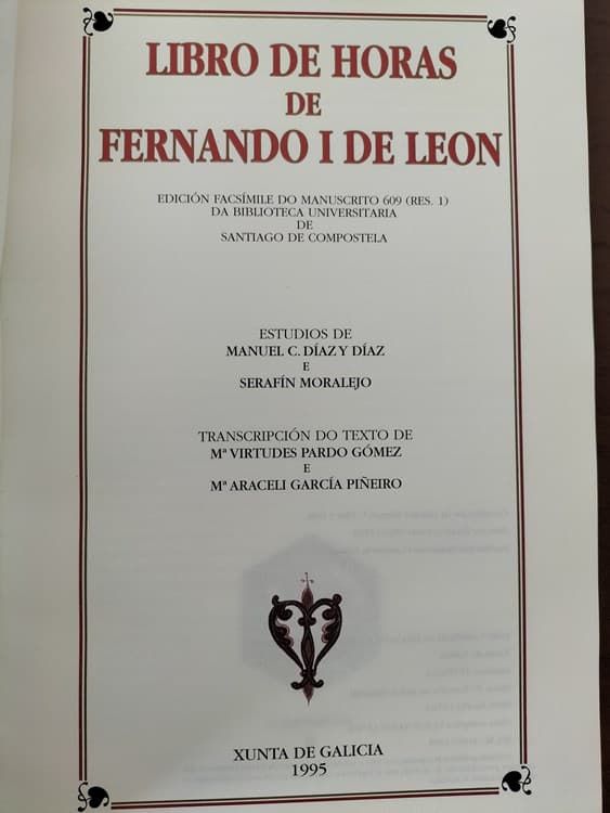 Extraordinaria edición facsimilar del manuscrito visigótico 609 (Res. 1) de la Universidad de Santiago de Compostela denominado “Libro de Horas de Fernando I de León”. Su nombre ha variado con el paso del tiempo: antes llevaba en una guarda el título de “Diurno de Fernando I”.