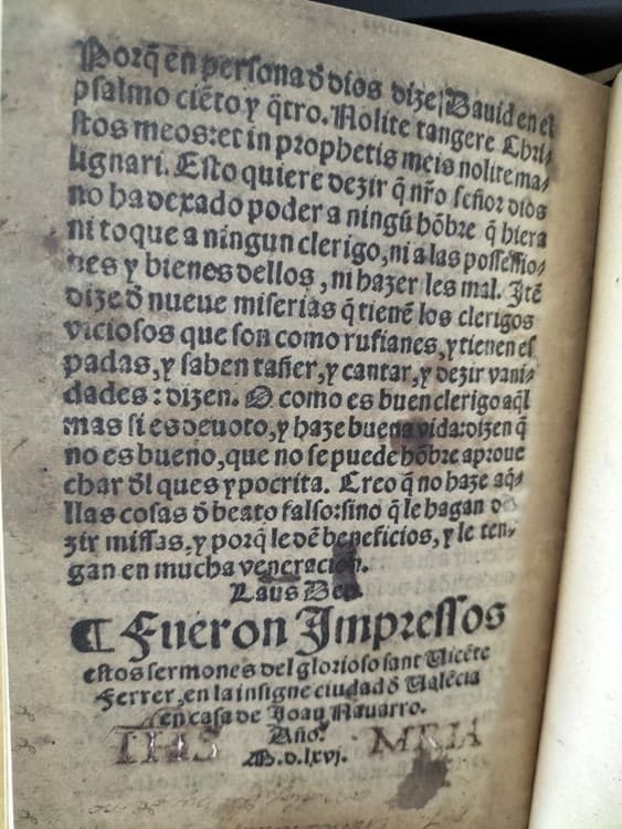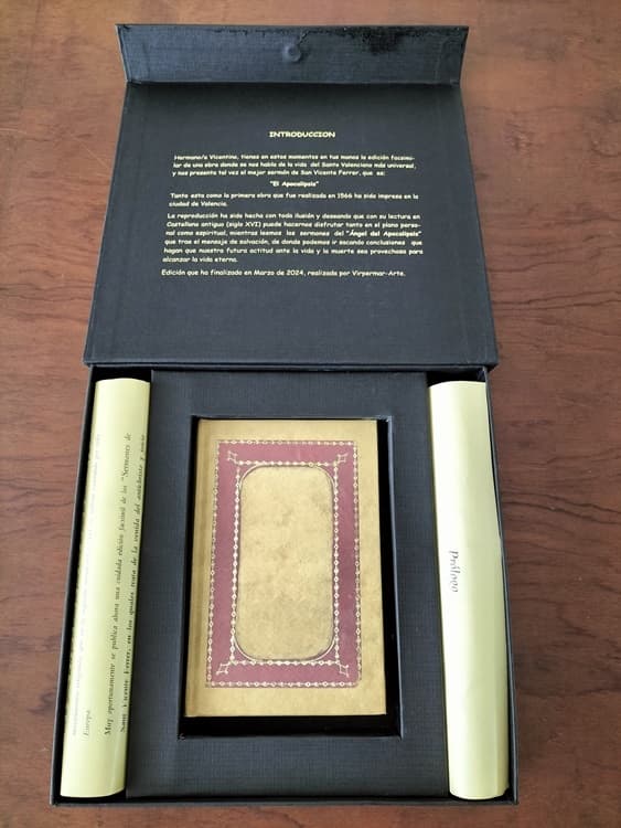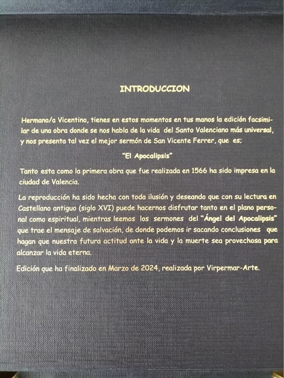 Edición facsimilar de la edición de 1566 en Valencia de los “Sermones de San Vicente Ferrer: en los quales trata de la venida del Antichristo y juycio final”, datados entre los años 1400 y 1420, realizada en Valencia en 2024 por la editorial Virpermar-Arte bajo la dirección de María Virtudes Pérez.